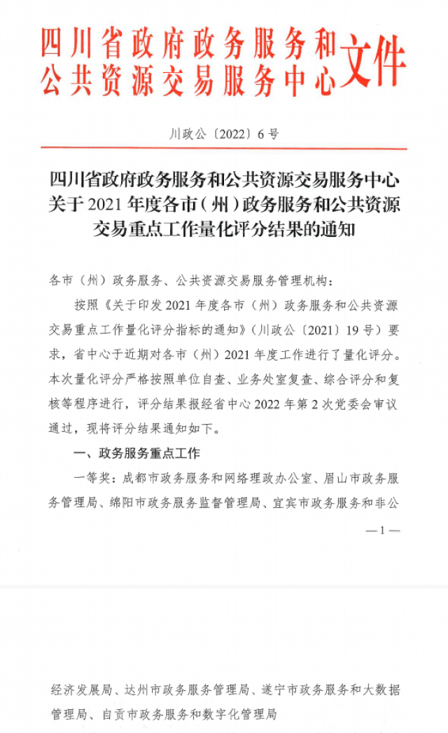 近日,四川省政务服务和公共资源交易服务工作视频会议在成都召开,会议表彰通报了2021年度全省政务服务和公共资源交易重点工作量化评分结果,达州市荣获2021年度政务服务重点工作量化评分一等奖,并作大会交流发言。